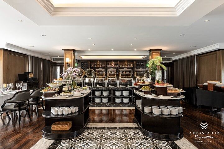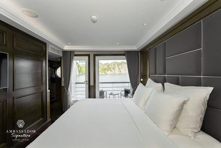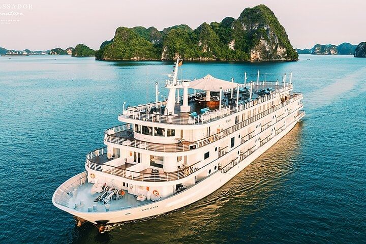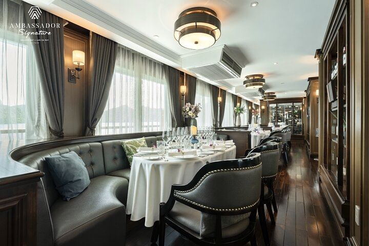 A serene Lan Ha Bay itinerary, 25 km away from Halong Bay, sets Ambassador Signature apart from its sister cruises. It explores pristine locations like Viet Hai Fishing Village and Dark-Light Cave, offering activities like fish lake visits, bee houses, ancient houses, fish foot massages, kayaking, and local rowing boat rides. If these excursions aren't your preference, you can opt for a massage while enjoying the bay's beauty from the sundeck or your private balcony.