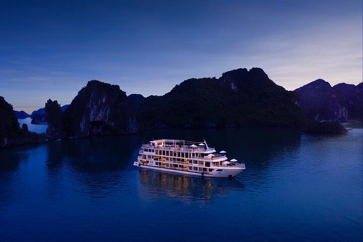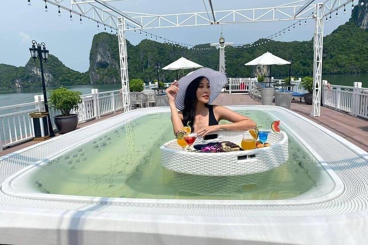 This luxury 5-star cruise features 18 elegant cabins, a fine-dining restaurant, two outdoor swimming pools, and a variety of high-end facilities. Each cabin spans 28m² and is beautifully designed in a neoclassical style, offering guests ultimate comfort and sophistication. Every room includes a private balcony with large glass doors, allowing natural light to fill the space and offering panoramic views of Halong Bay’s stunning limestone scenery. Guests can savor gourmet cuisine at the onboard restaurant, relax with professional spa treatments, or unwind on the spacious sundeck featuring an open-air bar — the perfect place to enjoy the serene beauty of the bay.